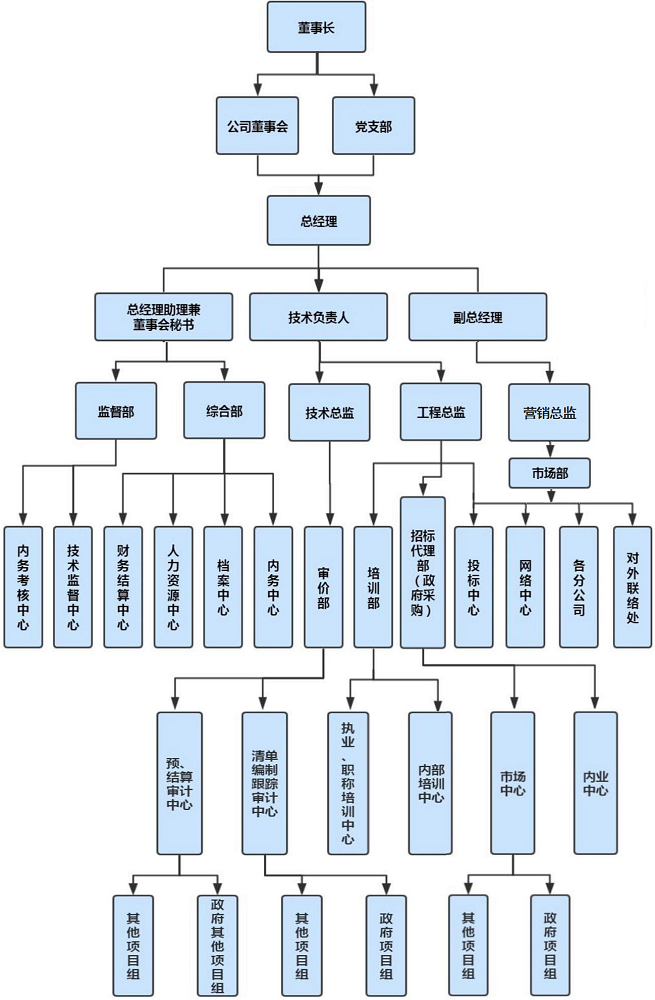 【组织机构】 公司设有董事长、党支部书记室、总经办、总工室、营销中心;辖设综合部、市场、培训部、审价部、招标代理部、监督部以及所属各专业营运中心。在董事长(兼支部书记、总经理)统一领导下,配备总经理助理、副总经理、技术负责人、技术总监、工程总监、营销总监、审价部主任、招标代理部主任、办公室主任、财务经理、投标专员、档案管理专员等各级管理人员,技术力量雄厚,服务质量上乘。