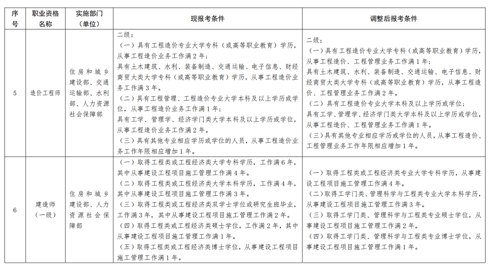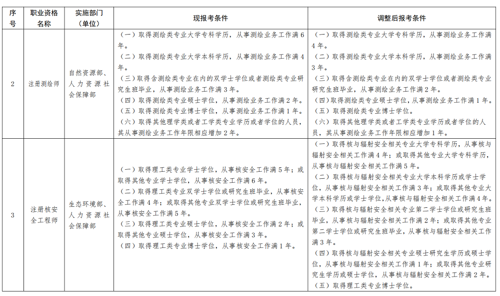 一、《部分准入类职业资格考试工作年限要求调整方案》(见附件)自2022年起实施。除调整考试工作年限要求外,13项准入类职业资格的其他考试报名条件不变。