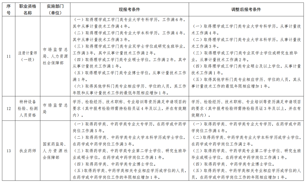根据国务院推进简政放权、放管结合、优化服务的改革部署,为贯彻落实《政府工作报告》要求,进一步推动降低就业创业门槛,经国务院同意,降低或取消《国家职业资格目录(2021年版)》中13项准入类职业资格考试工作年限要求。现就有关事项通知如下。