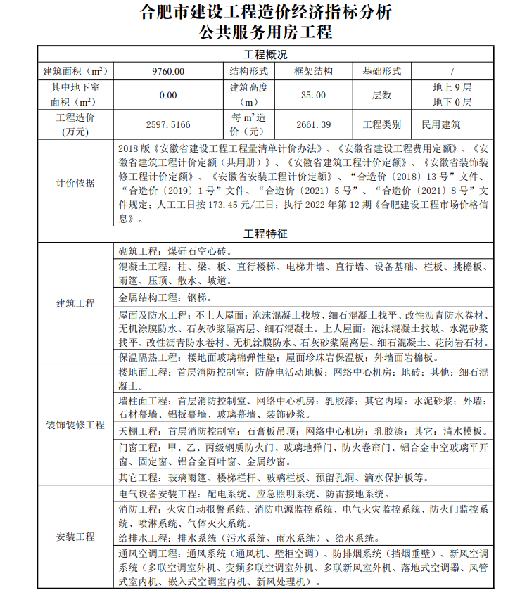 2023年1月合肥市建设工程造价经济指标分析--公用服务用房工程
