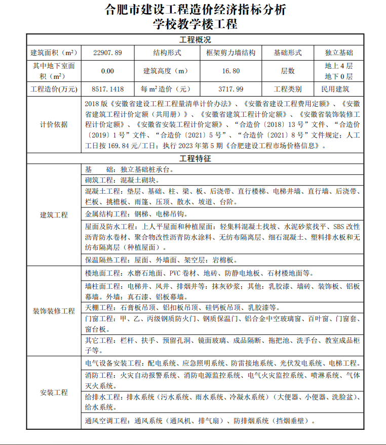 2023年6月合肥市建设工程造价经济指标分析--学校教学楼工程
