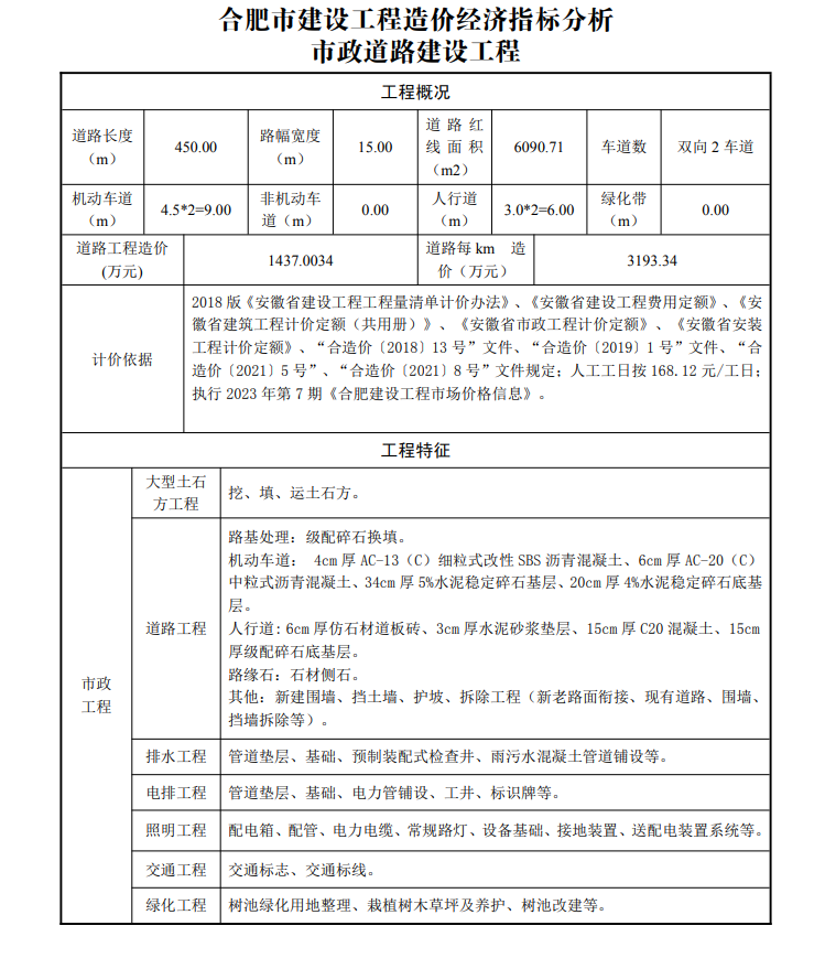 2023年9月合肥市建设工程造价经济指标分析--市政道路建设工程