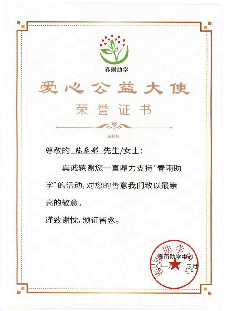 2018年公司总经理被春雨助学中心评为“爱心公益大使”