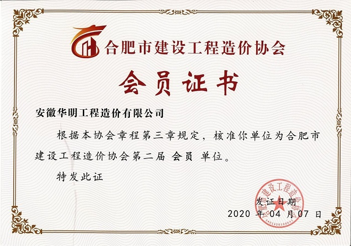 2020-2025年度为合肥市工程造价协会评定为“第二届”“会员证书